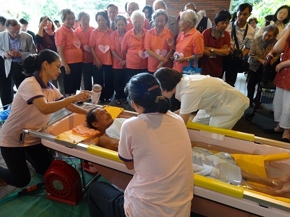 洗澡,是每個人的基本需求,對大眾來說也是一種放鬆紓壓,但對長期臥床的失能者而言,卻是耗盡心力的事情。由於行動不便,加上照顧者的體力有限,若是居家衛浴沒有無障礙的環境與設備,往往長期臥床者就只能擦澡,在生理衛生及心理尊嚴上都沒有被妥善對待,對家屬來說也容易產生內疚與煎熬。「到宅沐浴車」在日本已行之有年,台灣則始於2008年由中華聖母基金會創辦,車身和設備皆經由日本引進,採3人團隊,由一位護理人員、兩位照顧服務員一同到個案家中提供沐浴服務,空間上只需要一坪半的範圍,即可協助失能者進行全身沐浴,有效解決因長期臥床所致的褥瘡等皮膚疾病及新陳代謝方面的健康問題,並可減少在衛浴間因地板濕滑所隱藏的跌倒風險。