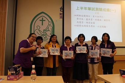恭喜上半年考核筆試測驗成績滿分,六位同仁:黎月桂、盧美雲、吳鳳妹、鍾秀琴、高麗雪、陳孫金蘭,特頒發成績優良獎狀,以茲鼓勵。