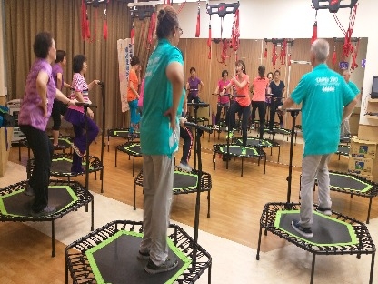 簡易操作的大肢體關節活動,配合音樂節奏,在彈跳床上進行暖身,利用彈跳床不穩定表面,更能激活深層肌肉參與。以音樂套裝設定雙腳、單腳、加速步型,透過腳步變化,全面刺激身體重心控制與肌耐力,再利用