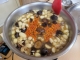 蒜頭雞作法:蒜頭去皮、香煎雞腿、浸泡香菇、三樣東西翻炒,加水滾煮,再加入枸杞和少許米酒