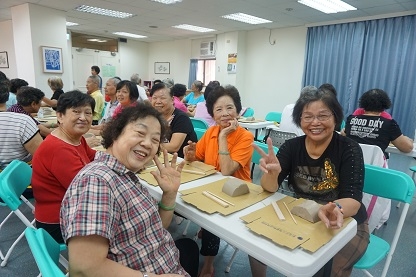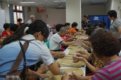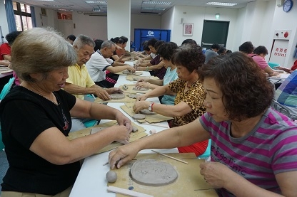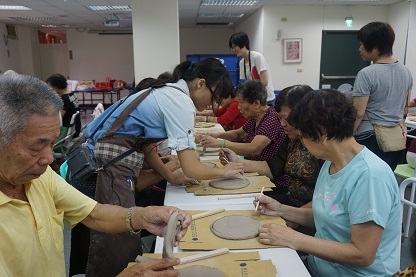這個禮拜很榮幸的邀請到新北市鶯歌陶瓷博物館的二位陶藝老師來為銀髮倶樂部的長輩教導「盤子」的製作。幾乎所有的長輩都沒有接觸過陶藝,對於今天的課程都感到很新鮮,一早就將桌椅就定位,等待老師的到來,看著她們期待的表情,真是覺得好可愛。二位老師很有耐心的邊示範邊解說,擔心長輩們聽不懂,還走下講台,親切的一一指導,每一個人都很認真的捏自己手上的陶土,仔細的雕塑成喜愛的盤子樣式,課程結束後,還有15位長輩委託陶博館燒窯,她們開心的表示要回去向家人展示自己的成品,在這一個小時中,看到了長輩因為這堂課製作的成品而產生的成就感,不禁有些感動,也看到了課程的背後真正的意義。