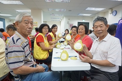 彩繪柚子的活動在老師的教導下,長輩們都很認真的為自己手中柚子做造型,雖然部份阿嬤在下筆時沒有信心,但透過工作同仁及志工的鼓勵,最後還是完成了可愛的柚子造型---龍貓,當集合所有人的作品拍照時,長輩們都非常開心搶著拍呢!