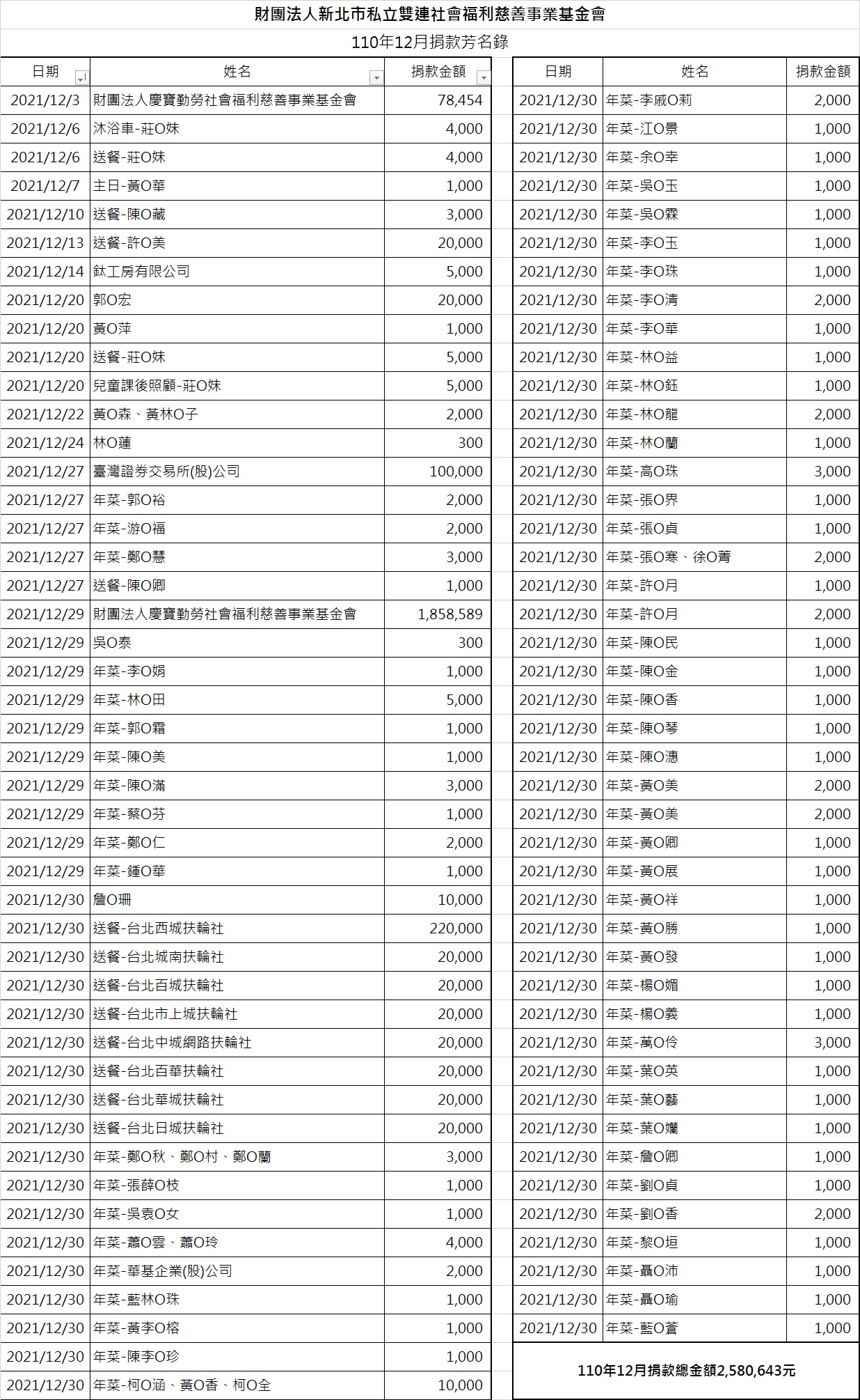 110年12月份捐款徵信芳名錄