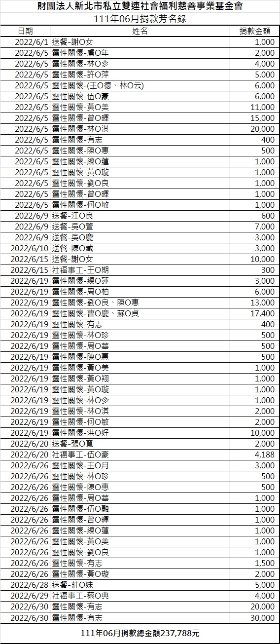 111年06月份捐款徵信芳名錄