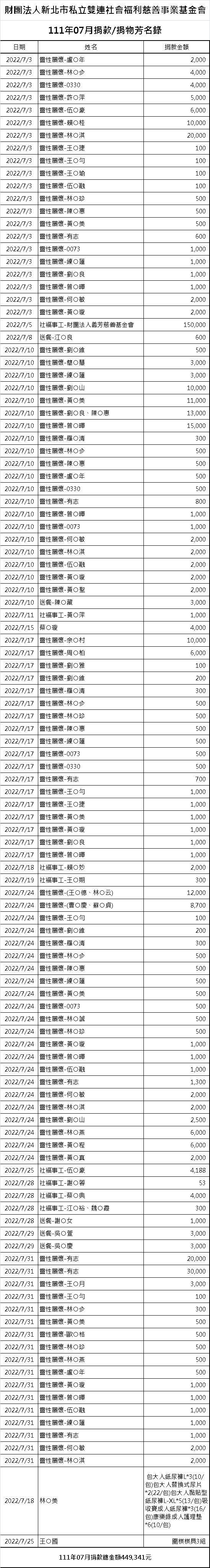 111年07月份捐贈徵信芳名錄