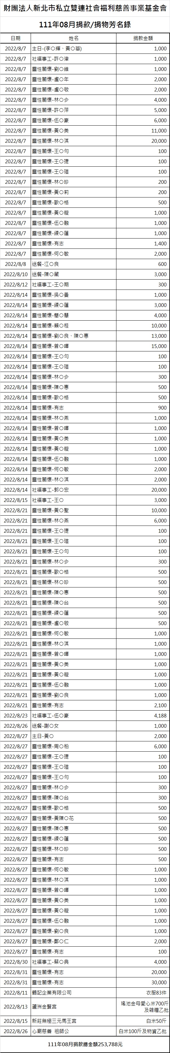 111年08月份捐贈徵信芳名錄