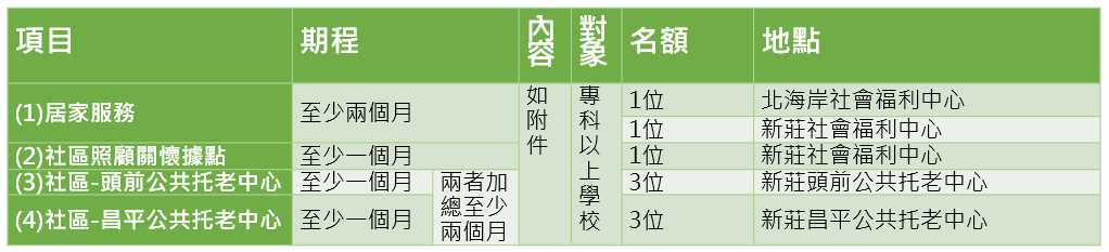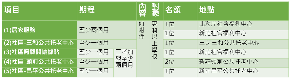 配合各校學生實習計畫,提供學生學習長期照護-社區式服務、居家式服務等整合式多層級連續性的實務工作機會,增進學生對於社會福利服務照顧產業相關議題之探討,從中也能了解長期照護體系內跨專業團隊的合作模式與各司其職的角色任務,進而提高學生從事社會福利服務工作之興趣,培植長照專業人才。
