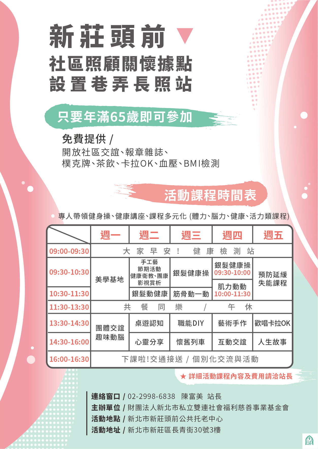 新莊頭前社區照顧關懷據點設置巷弄長照站:(02)2998-6838 轉3樓 洽陳富美站長