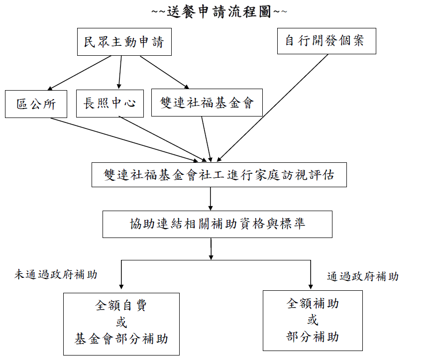 2.中低收入戶全額補助或補助90%(依政府核定結果)。 3.一般戶全額自費100元/餐。 四、營養餐飲服務申請流程圖 五、志工招募 送餐業務需要有服務熱忱的志工持續的投入,我們才有辦法繼續來為失能、獨居的長者送餐,讓煮食不便及行動不便的長者能溫飽需要您的加入。