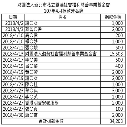 【公告】107年4月捐款芳名錄