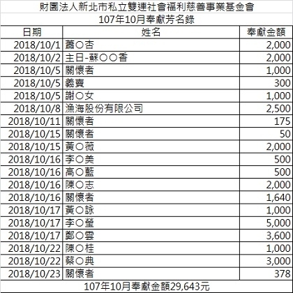 【公告】107年10月捐款芳名錄