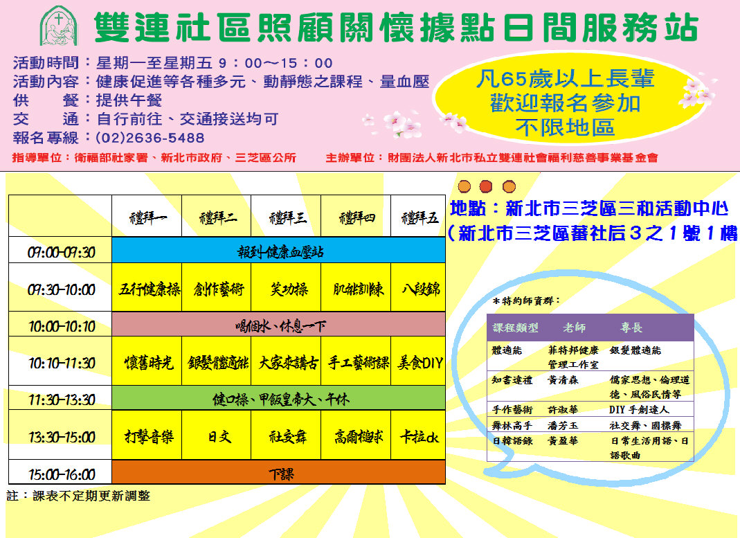(雙連北海岸社福中心)社區照顧關懷據點日間服務站~~凡65歲以上長輩,歡迎報名參加